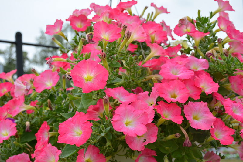 Easy Wave® Rosy Dawn Petunia is smothered in stunning rose trumpet-shaped flowers with yellow throats and white centers at the ends of the stems from mid spring to late summer. Its pointy leaves remain green in color throughout the season.