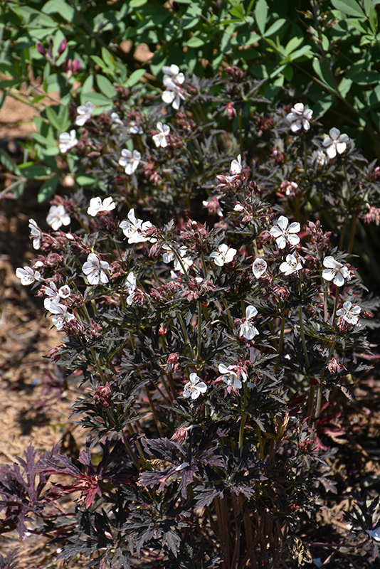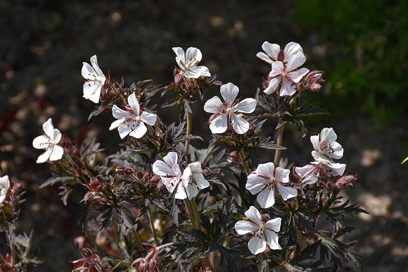Midnight Ghost Cranesbill has masses of beautiful white star-shaped flowers at the ends of the stems from late spring to mid summer, which emerge from distinctive dark red flower buds, and which are most effective when planted in groupings. Its attractive deeply cut lobed palmate leaves emerge grayish green in spring, turning deep purple in color with hints of black throughout the season.