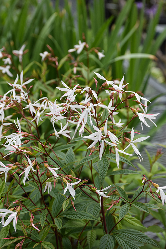 Bowman's Root features airy corymbs of white star-shaped flowers with crimson calyces rising above the foliage from late spring to early summer. The flowers are excellent for cutting. Its attractive serrated pointy compound leaves are olive green in color. As an added bonus, the foliage turns gorgeous shades of yellow, coppery-bronze and burgundy in the fall. The dark red stems can be quite attractive.